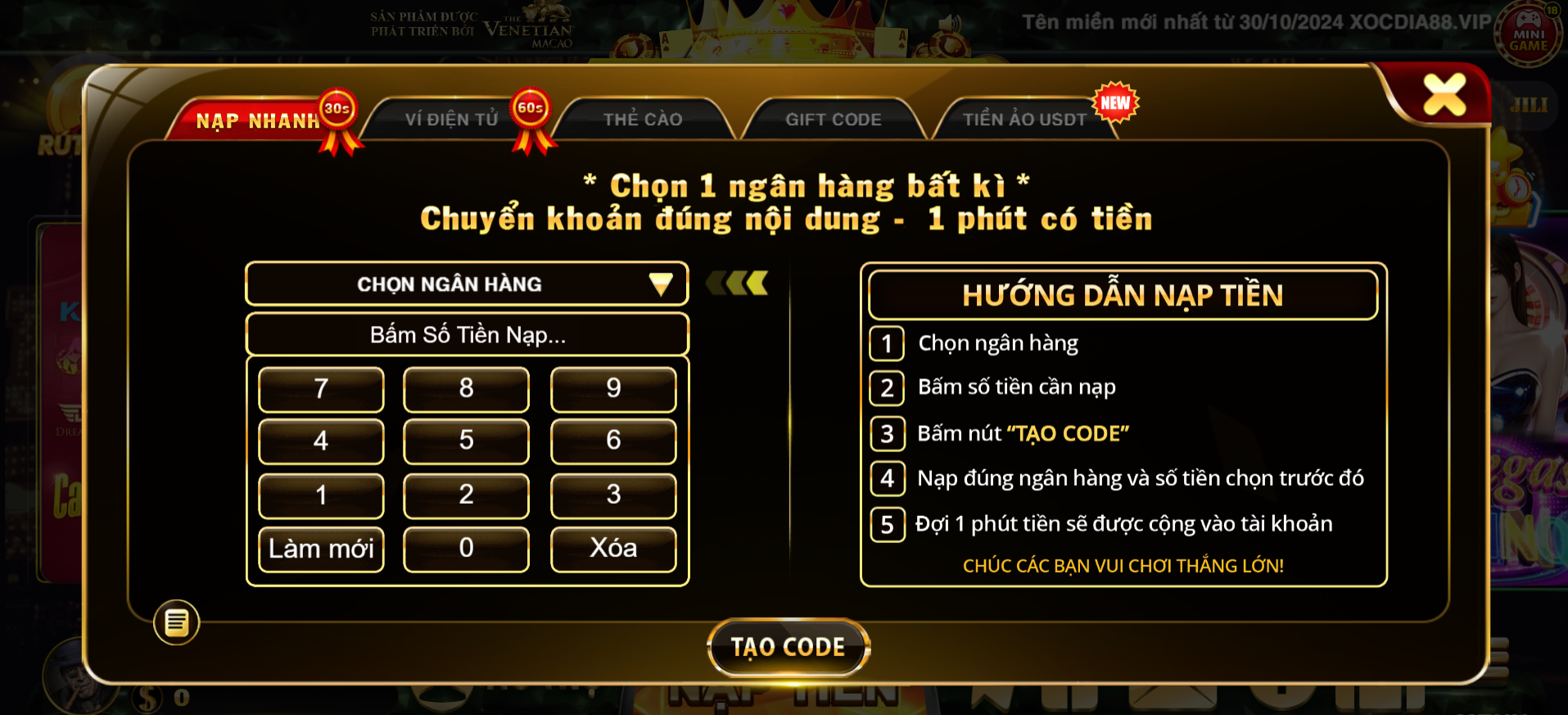 Nạp nhanh Xocdia88 chỉ mất 1 phút có tiền ngay